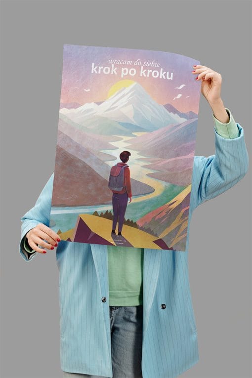 Plakat „Wracam do siebie krok po kroku”, porusza temat osobistej drogi rozwoju, samopoznania, stopniowego dążenia do równowagi i spokoju. Każdy nasz krok, emocja, decyzja, doświadczenie są częścią drogi, którą kroczymy do poznania samego siebie.